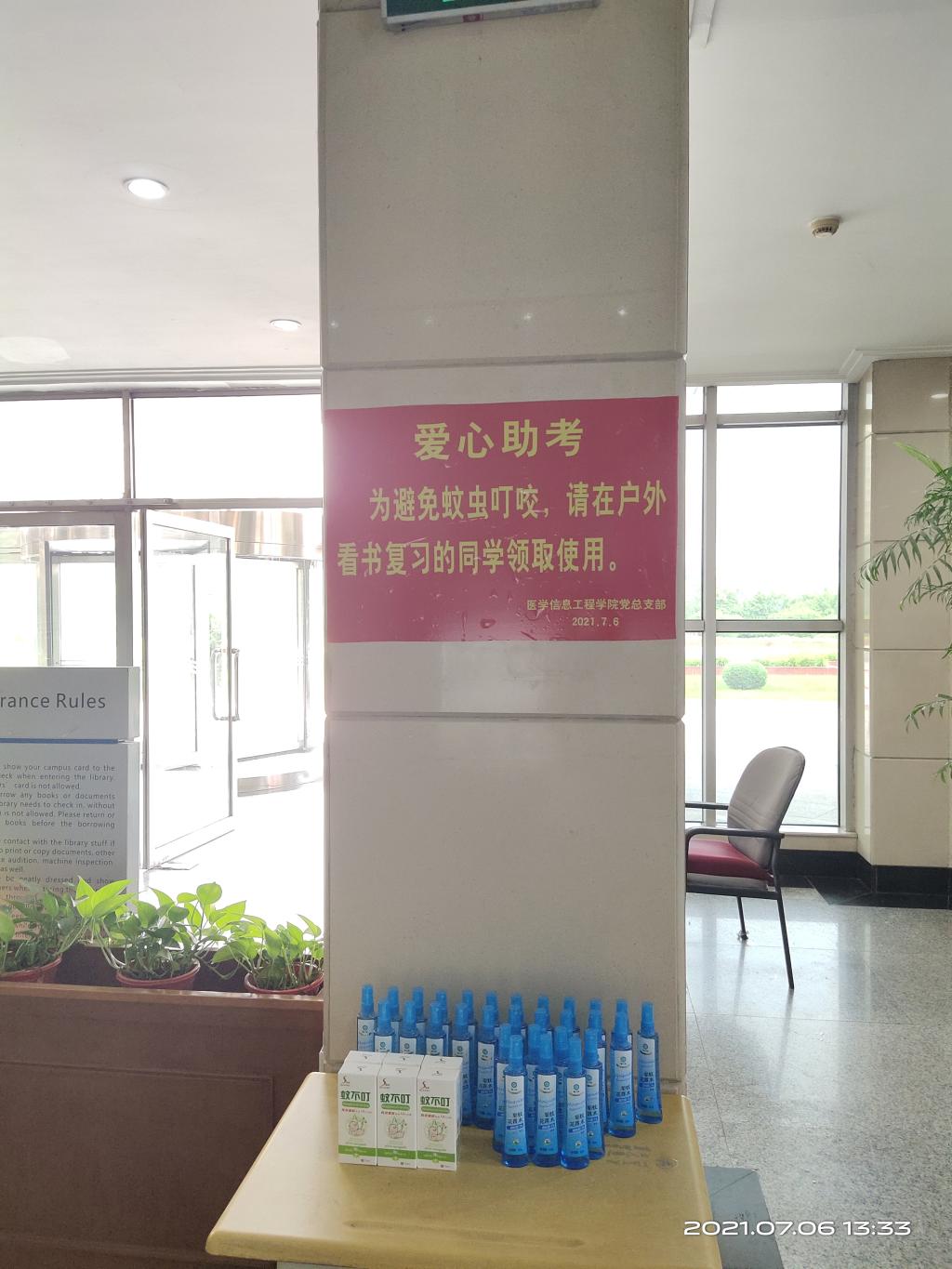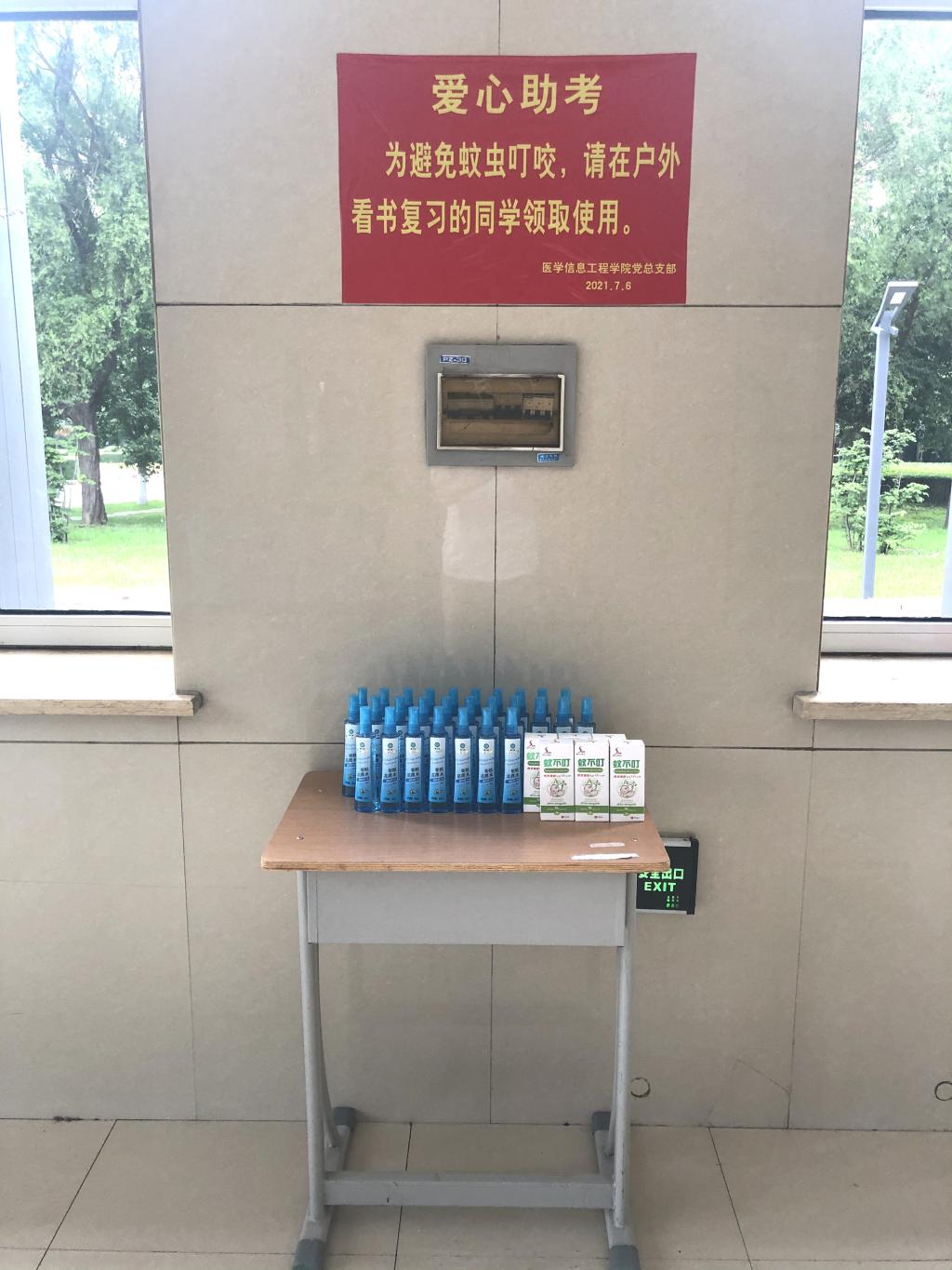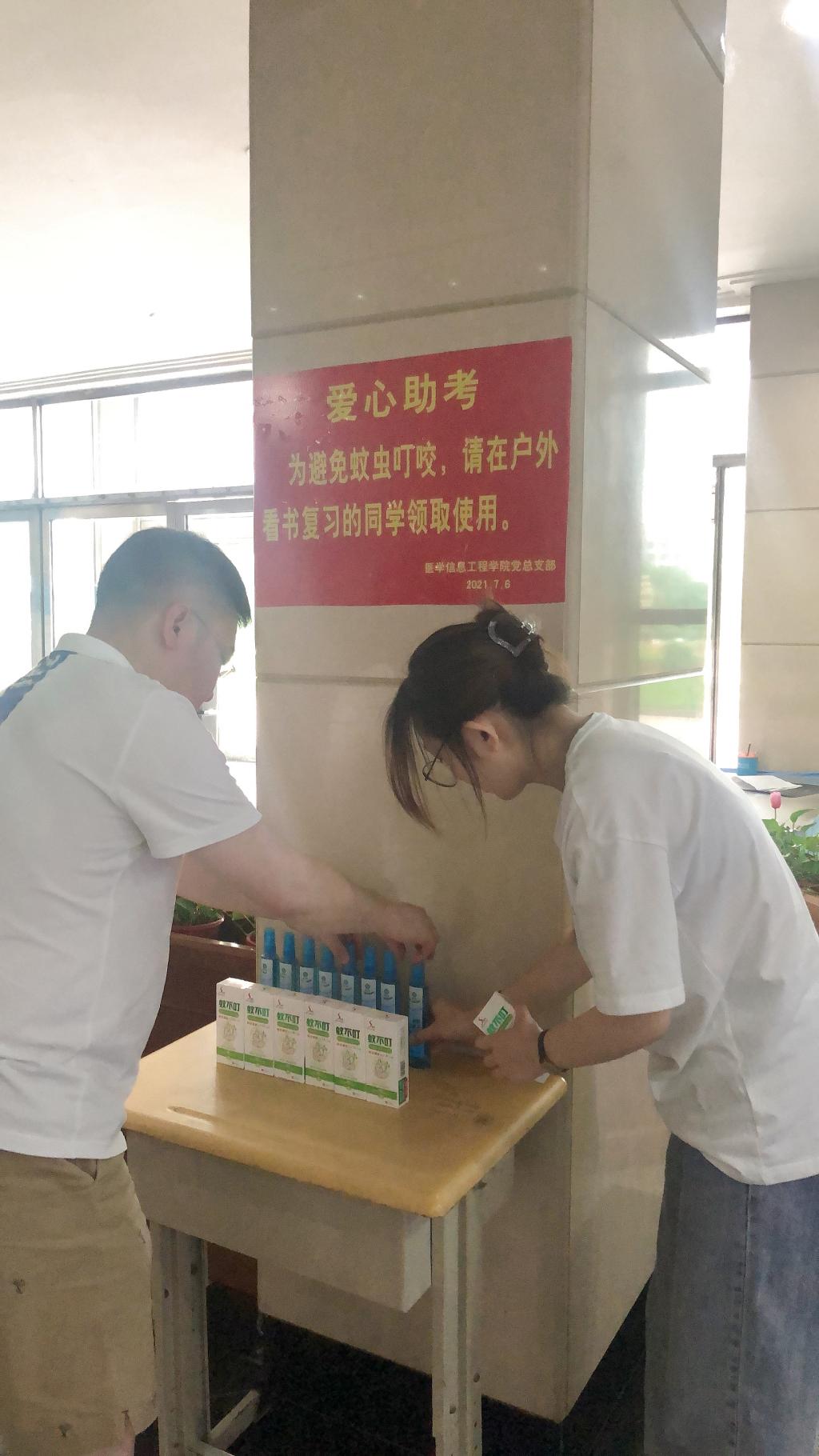 为了帮助期末备考的学生更好地复习,365best体育亚洲官网党总支部继续开展“践行初心,爱心助考”活动,7月6日,为在户外看书的同学们提供便携式驱蚊花露水,分别放置在致远楼一楼、图书馆一楼大厅,方便学生领取使用。