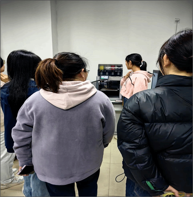 随后,熊昱引领成员们到3D打印机前了解相关注意事项。讲解过程中着重强调了打印后要清理残留材料,防止在以后的使用过程中发生喷头堵塞。打印耗材要密封处理,过长时间暴露在外界需要烘干处理。打印文件需导入切片软件。