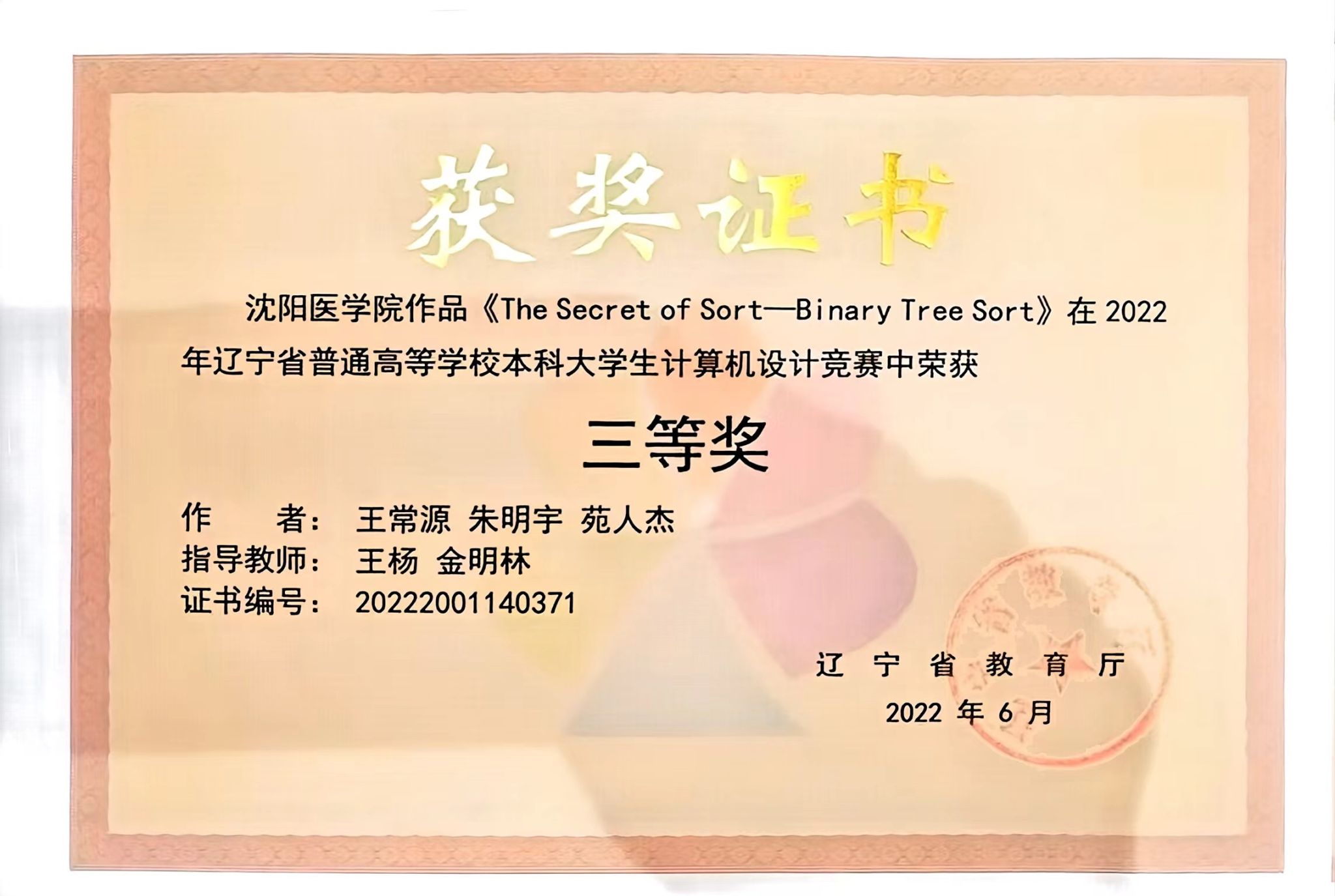 在大学生设计大赛中,365best官网学生团队的作品《The secret of sort - binary tree sort》荣获辽宁省大学生计算机设计大赛三等奖、中国大学生计算机设计大赛三等奖。 在这场激烈的竞争中,我们不仅展示了过硬的技术实力,更传递出了科学探索的精神和团队协作的力量。从项目构思到算法实现,再到现场展示,每一个环节都凝聚了团队成员无数个日夜的辛勤努力和智慧结晶。